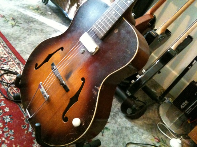 It’s unusual in that it is a semi-acoustic electric guitar but with no f-holes (they are painted on) and with a solid piece down the middle. it has a totally flaky tremolo system that puts it out of tune of you’re not really gentle, and ??? like many 60s guitars ??? the pickups are wired out of phase with each other so using them together sounds totally different than using them separately. Basically it has a really distinctive retro sound which I love and I have been using it as my main electric ever since i got it back into shape (though my other one will be needed for situations where the sound needs to be more conventional). Paired with the Vox valve amp (a relatively recent model but based on the original 60s Vox circuitry, and running through an early 70s Vox cabinet) it sounds like it’s coming to you straight out of 1969. of course I couldn???t even play guitar when i was one year old, but if I could it would have sounded just like this.